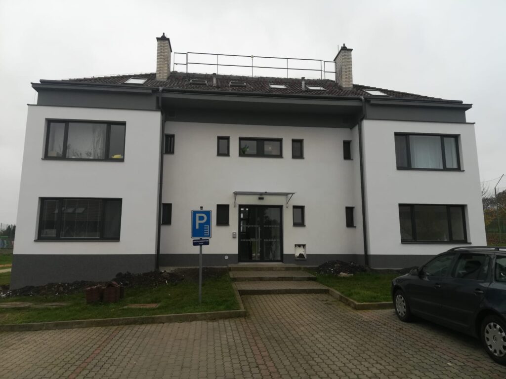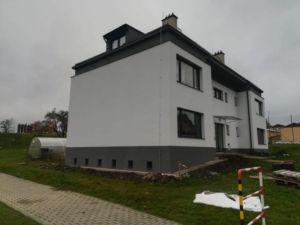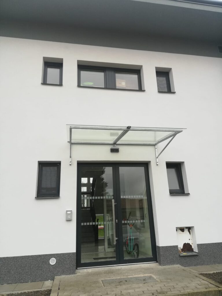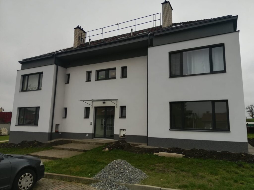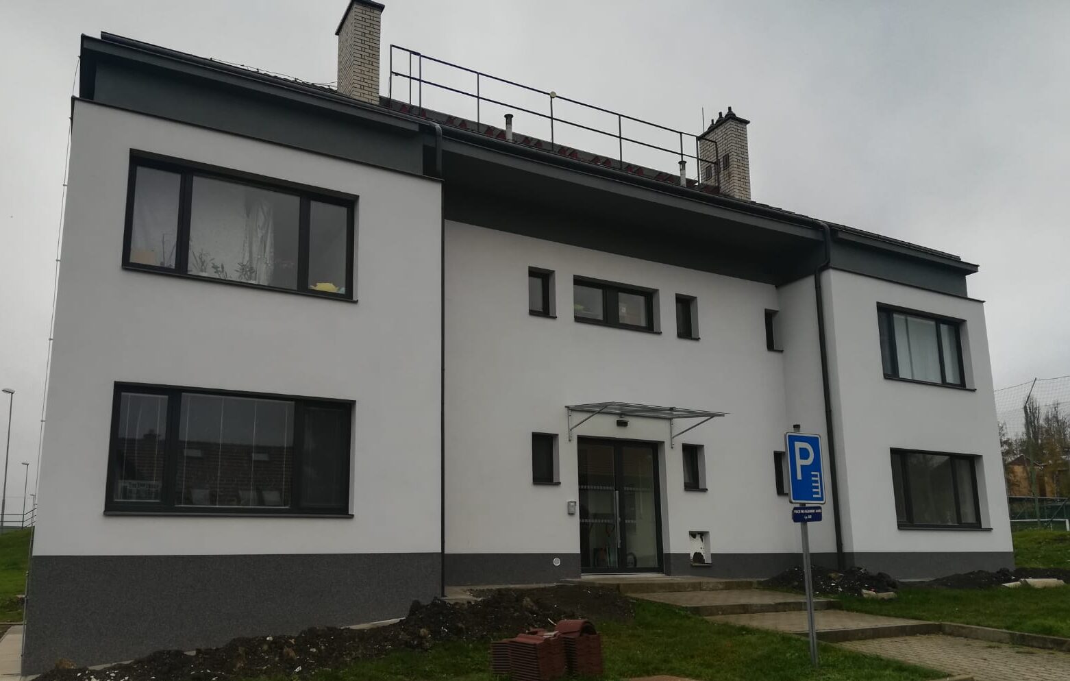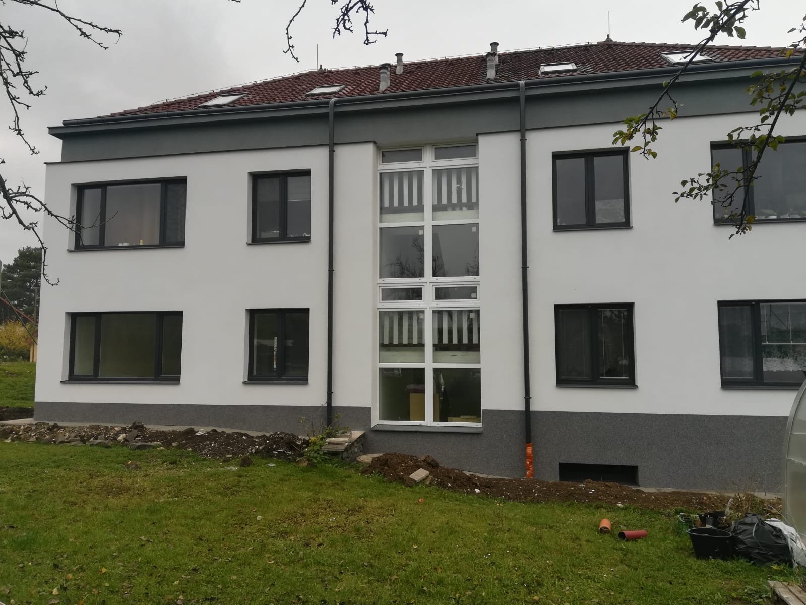 V rámci rekonstrukce bytového domu proběhla i výměna oken a vchodových dveří. Okna jsme dodávali plastová z profilu VEKA76, vchodové dveře jsou hliníkové z profilu ALUPROF. Barva oken i dveří je z venkovní strany v dekoru anthrazitgrau/RAL 7016, dveře jsou opatřeny samozavíračem, elektrickým vrátným a plnobarevnými značkami v šedé barvě. V rámci zakázky jsem prováděli demontáž původních oken, montáž nových oken včetně montáže parotěsných a paropropustných pásek a zednické zapravení.