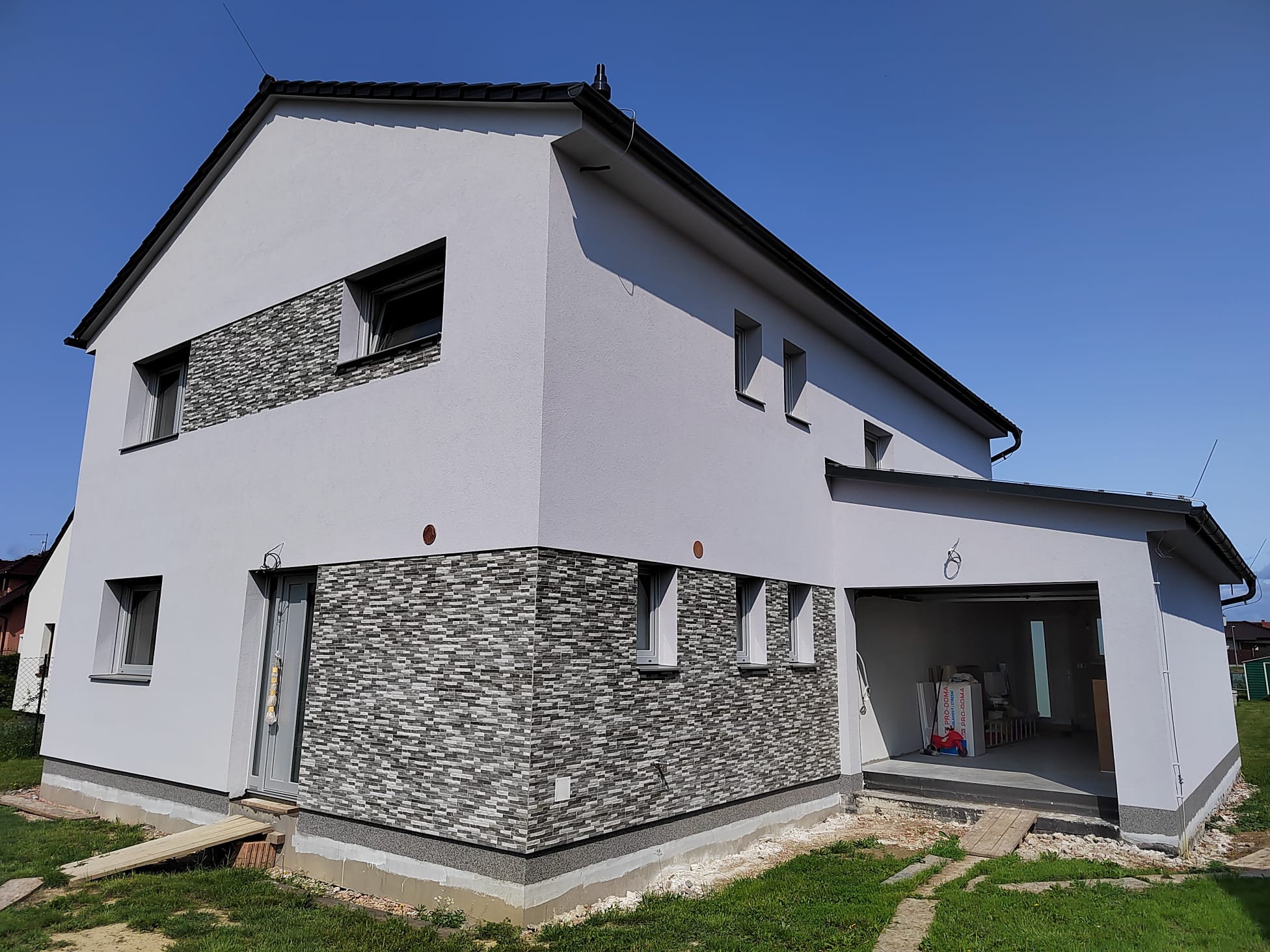 U zakázky montáže oken a dveří jsme dodávali a montovali výplně do novostavby rodinného domu. Vše je vyrobeno z německého profilu VEKA82 v netradiční barvě aluminium geburstet. Součástí dodávky byla motnáž oken, vchodových dveří a HS portálu včetně montáže parotěsných a paropropustných pásek.